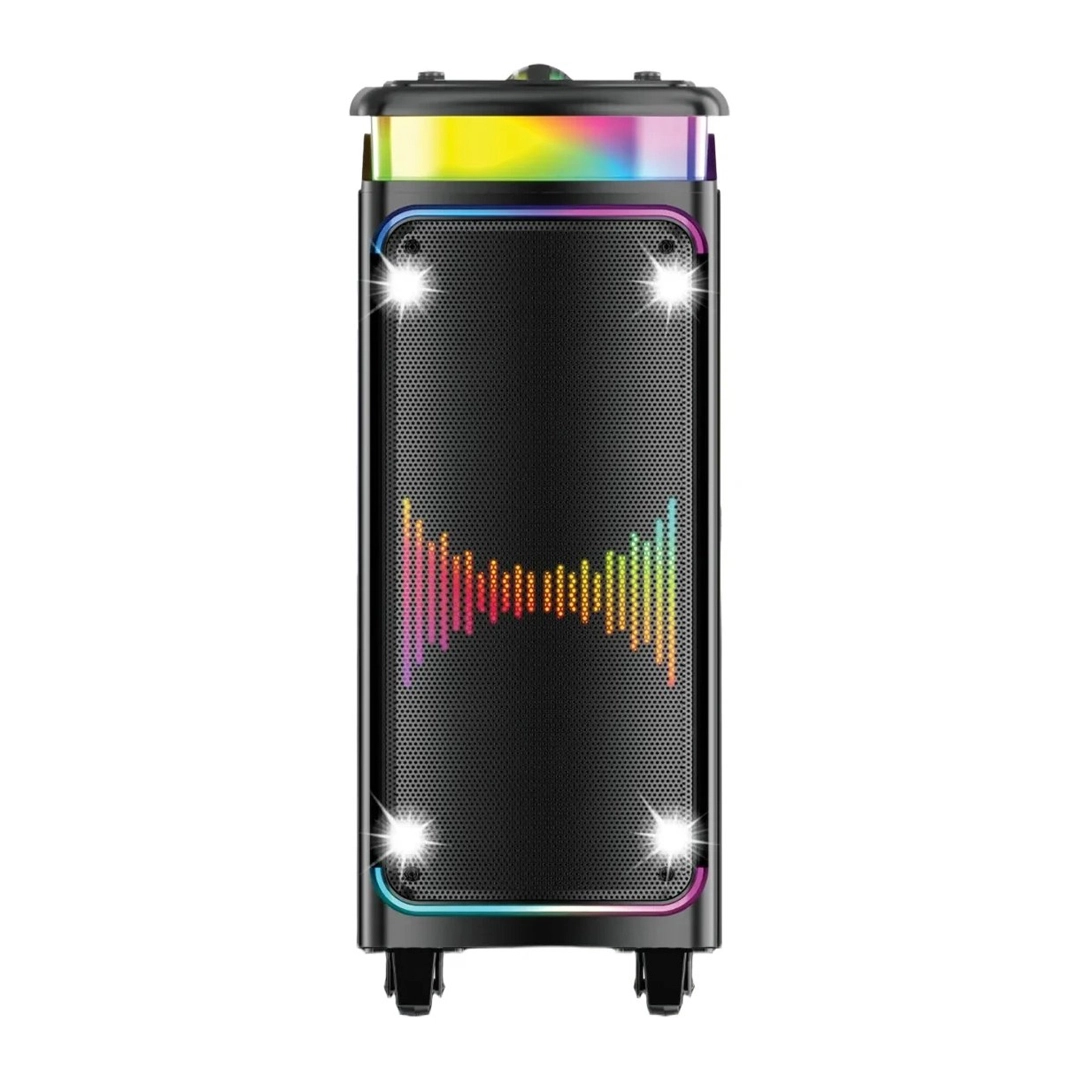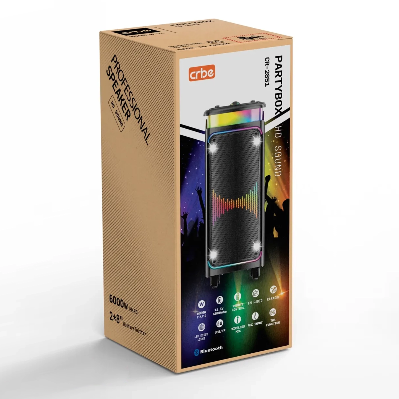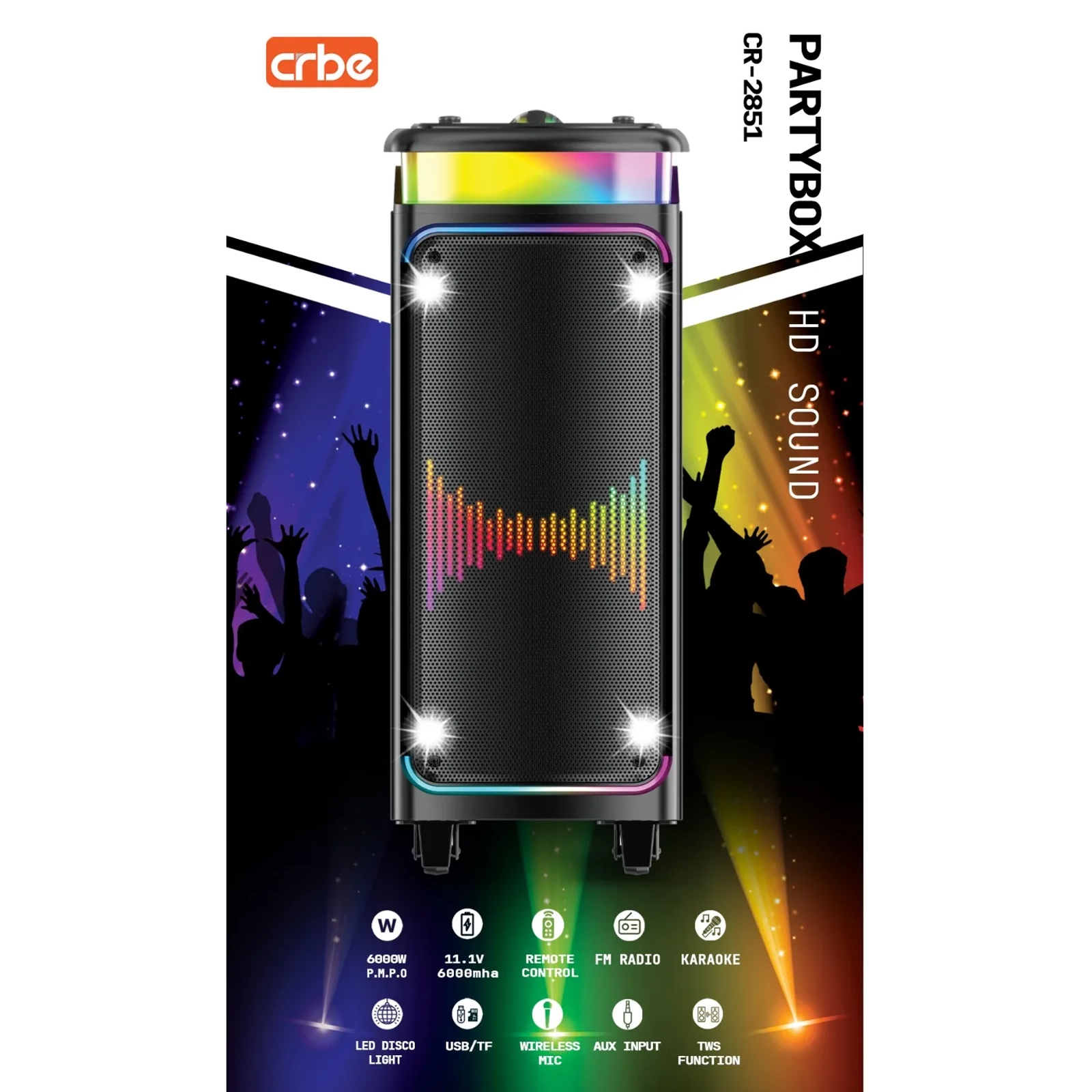 اسپیکر قدرتمند CRBE CR-2851 انتخابی ایدهآل برای کسانی است که به صدای بلند، بیس قوی و طراحی جذاب اهمیت میدهند. این پارتی باکس با توان خروجی 6000 وات P.M.P.O و باتری قدرتمند 6000 میلیآمپری (11.1V) تجربهای طولانی و پرانرژی از پخش موسیقی را فراهم میکند.نورپردازی LED دیسکو با افکتهای رنگی هماهنگ با موسیقی، فضای هر مهمانی را به اوج هیجان میرساند. همچنین وجود قابلیتهای کارائوکه (Karaoke)، میکروفون بیسیم و ریموت کنترل، آزادی عمل و سرگرمی بیشتری در اختیارتان میگذارد.