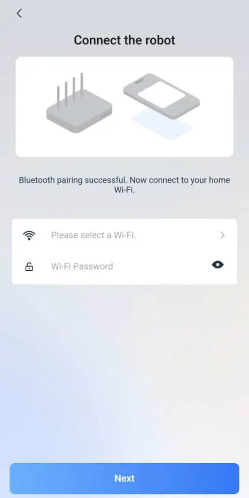 پس از اسکن وارد صفحه بعدی میشود که در این مرحله باید ربات را به وای فای متصل کنید و رمز وای فایرا وارد کنید .