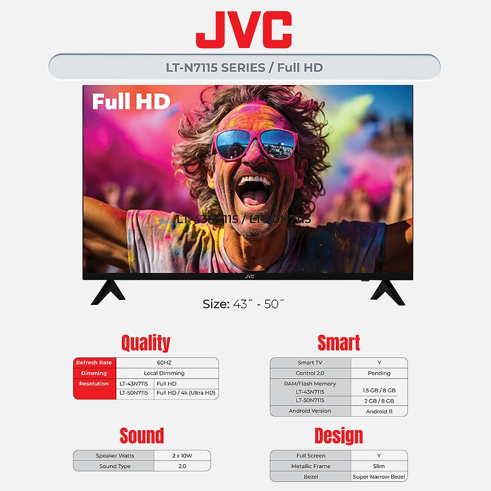 تلویزیون هوشمند ۴۳ اینچ JVC 4K UHD با پشتیبانی از گوگل پلی، نتفلیکس، یوتیوب، وای فای، مدل مشکی - LT43N7115 - ۱ سال گارانتی.۴K UHD با وضوح ۴ برابر بیشتر از تلویزیونهای FHD. برنامههای مورد علاقه خود را با لذت تماشا کنید، در جدیدترین فیلمها غرق شوید یا در هر لحظه از داغترین بازیها هیجانزده شوید.