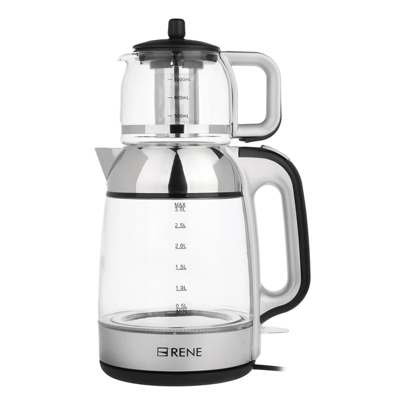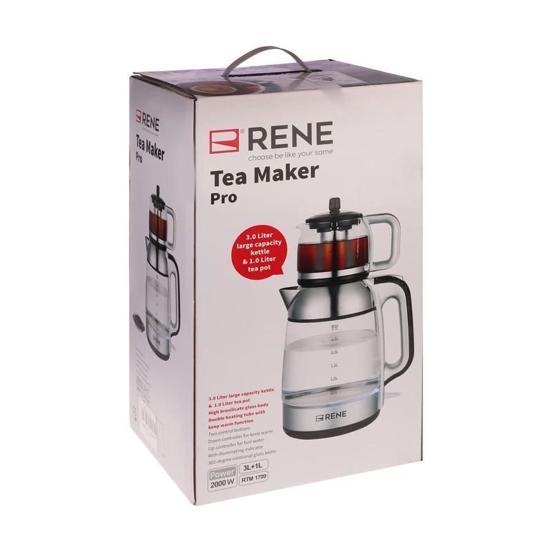 چای ساز مدل: 1709 RTM برند : رنه RENE / دارای ترموستات / دارای دو دکمه کنترل با عملکرد گرم نگهدارنه و حالت جوش / دارای نشانگر روشن بودن چایساز / چرخش ۳۶۰ درجهای شیشه کتری / دارای دو واشر گرمایشی برای بهبود عملکرد گرم نگهداشتن آب / سرعت عملکرد بالا.